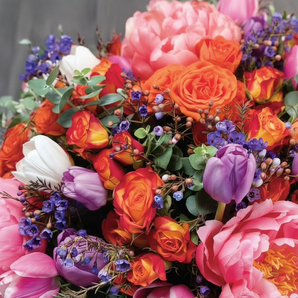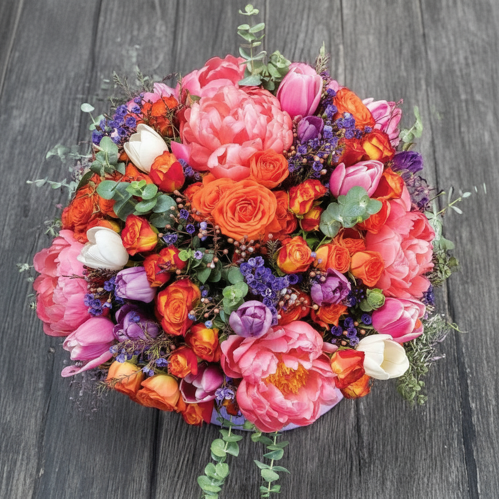 An elegant arrangement of premium mini roses, tulips, peonies, and eucalyptus in a round box. The delicate flowers are thoughtfully combined to create a sophisticated and refined floral display