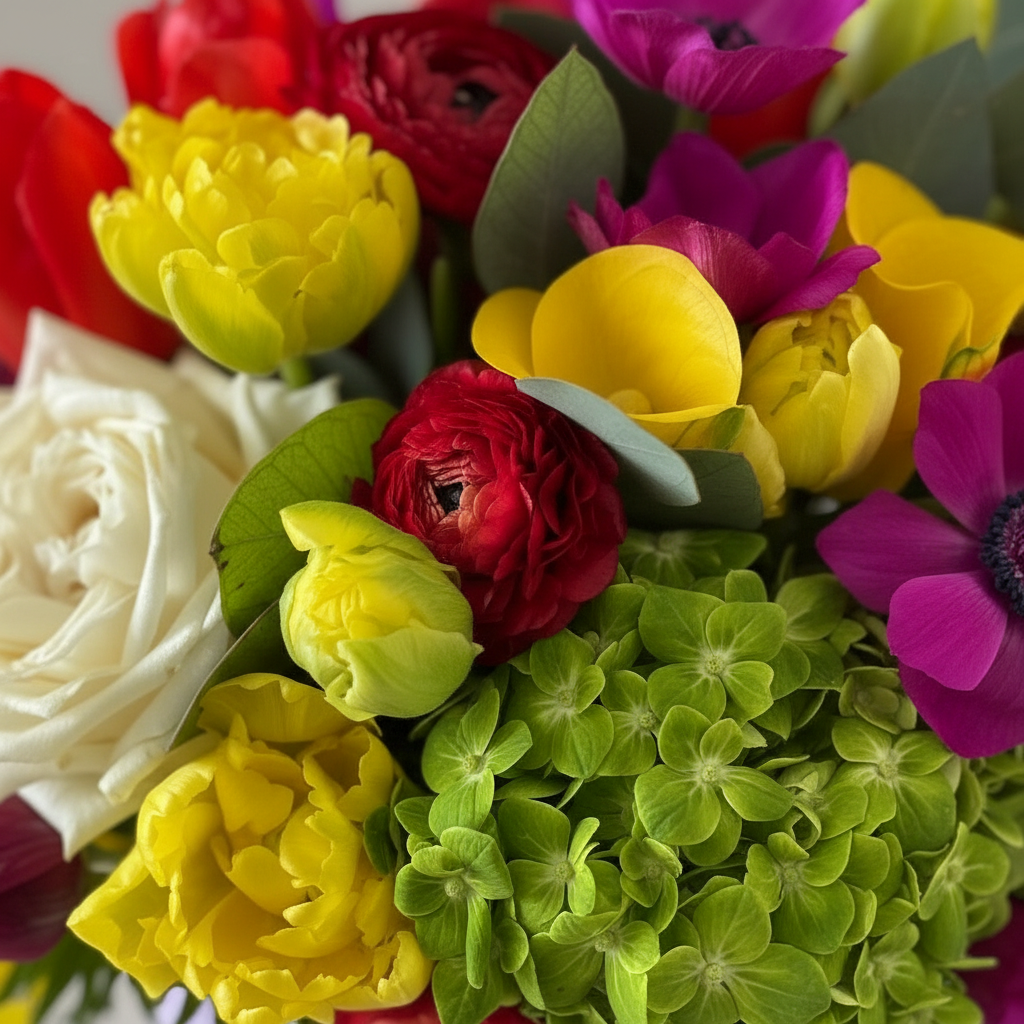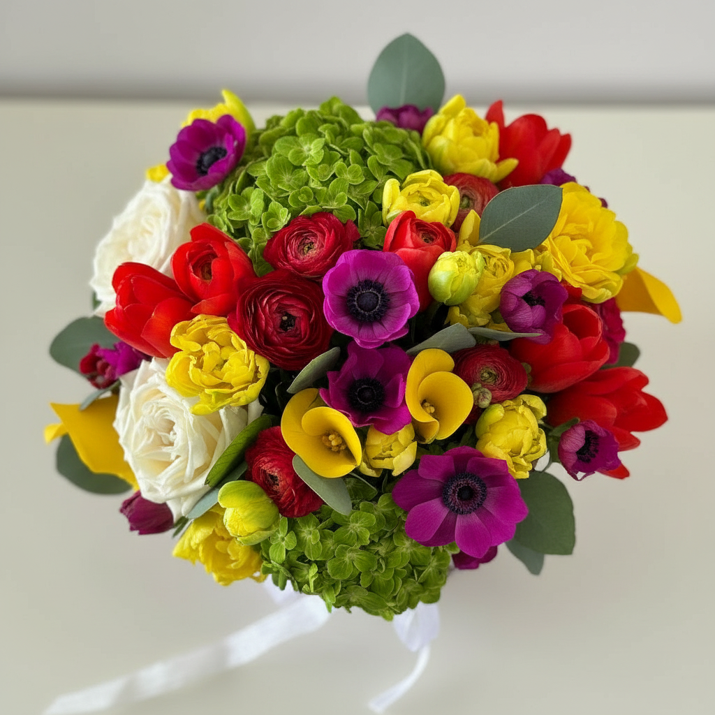 A luxurious arrangement of premium roses, lisianthus, hydrangeas, calla lilies, eucalyptus, and tulips, elegantly presented in a round box
