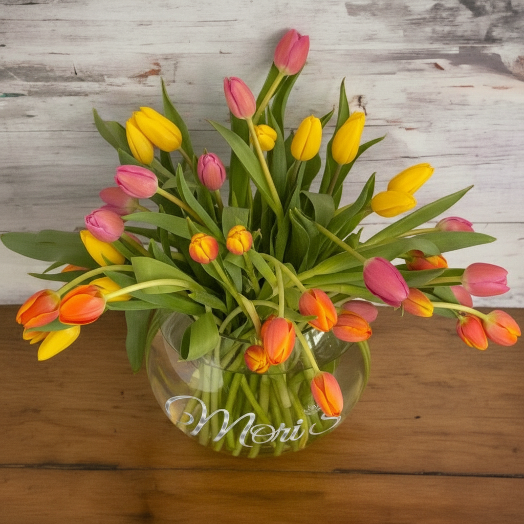 An elegant arrangement of colorful tulips in a glass vase, showcasing vibrant hues of red, pink, yellow, and purple, creating a fresh and sophisticated display. The delicate petals and graceful stems are beautifully complemented by the transparent glass, adding a touch of class to any setting.