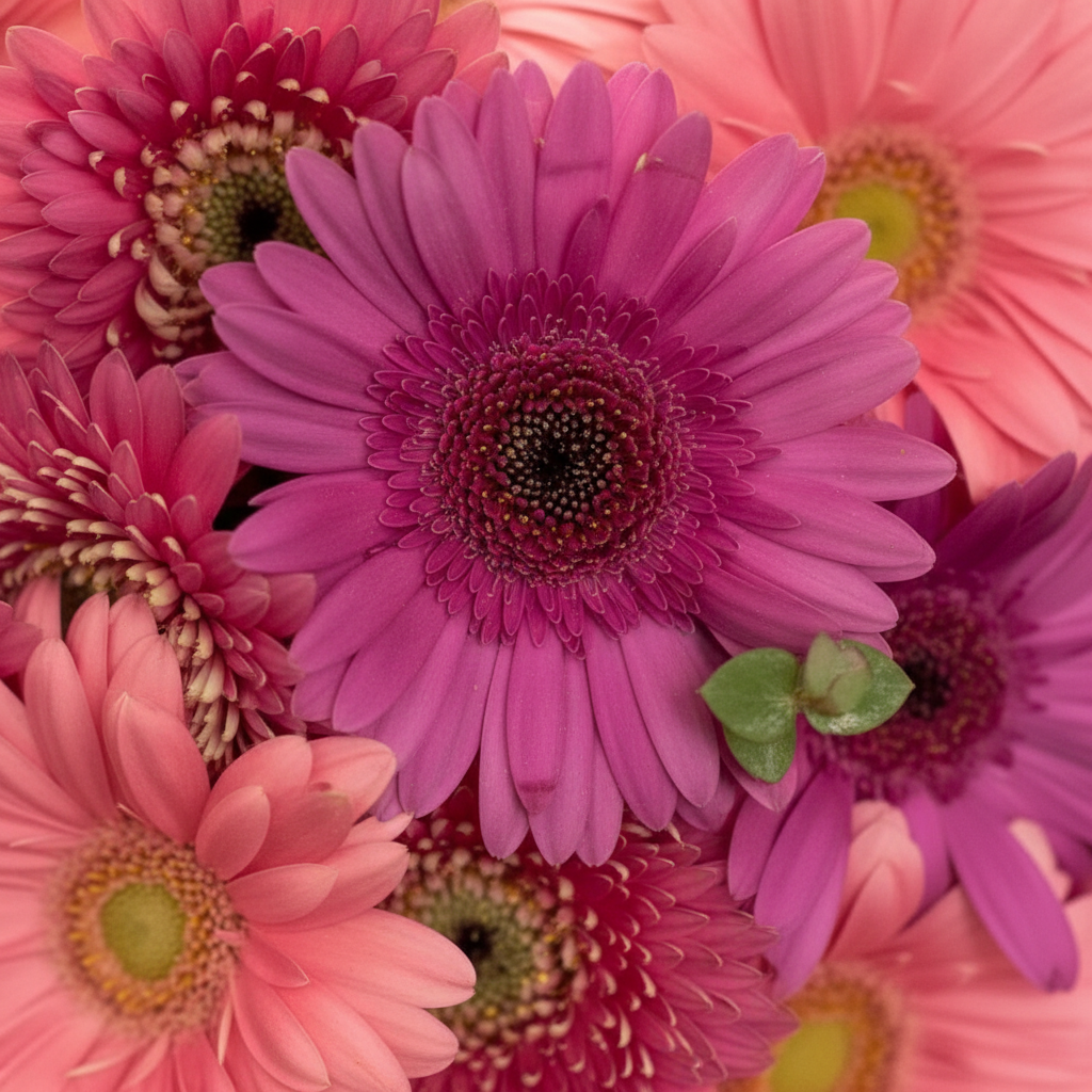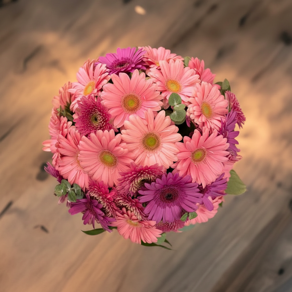 An elegant arrangement of colorful gerbera daisies and eucalyptus in a glass vase. The vibrant gerberas create a cheerful contrast with the soft greenery of the eucalyptus, giving the arrangement a fresh, sophisticated loo