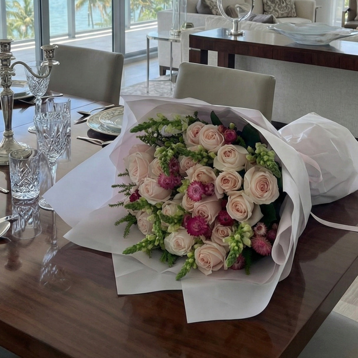 bouquet of soft pink roses, elegantly arranged with delicate greenery and subtle foliage, exuding a refined and graceful charm. The roses are lush and full, complemented by the gentle, calming hues of the leaves, creating a sophisticated and timeless look.