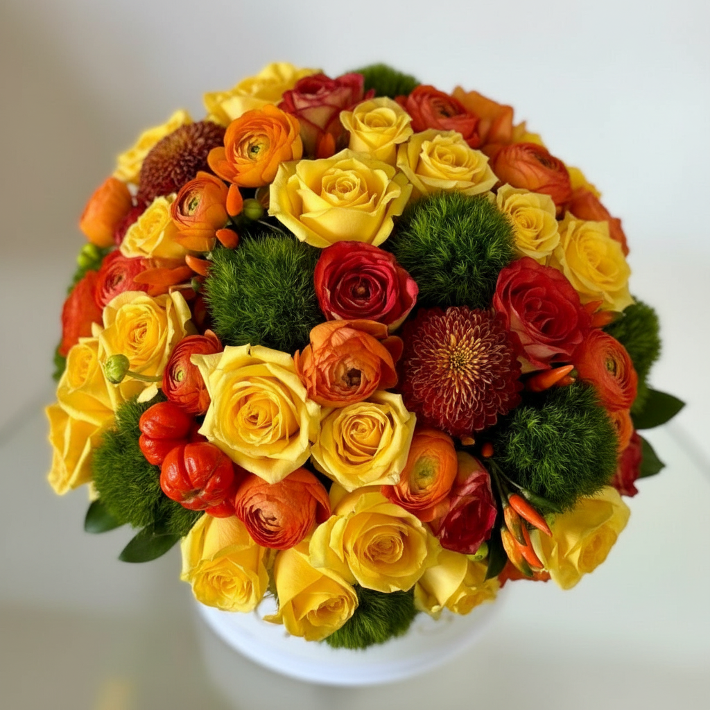 An elegant arrangement featuring premium roses, chili peppers, ranunculus, and mini pumpkins in a round box. This sophisticated design blends vibrant colors and textures, creating a stunning and unique display perfect for any special occasion.