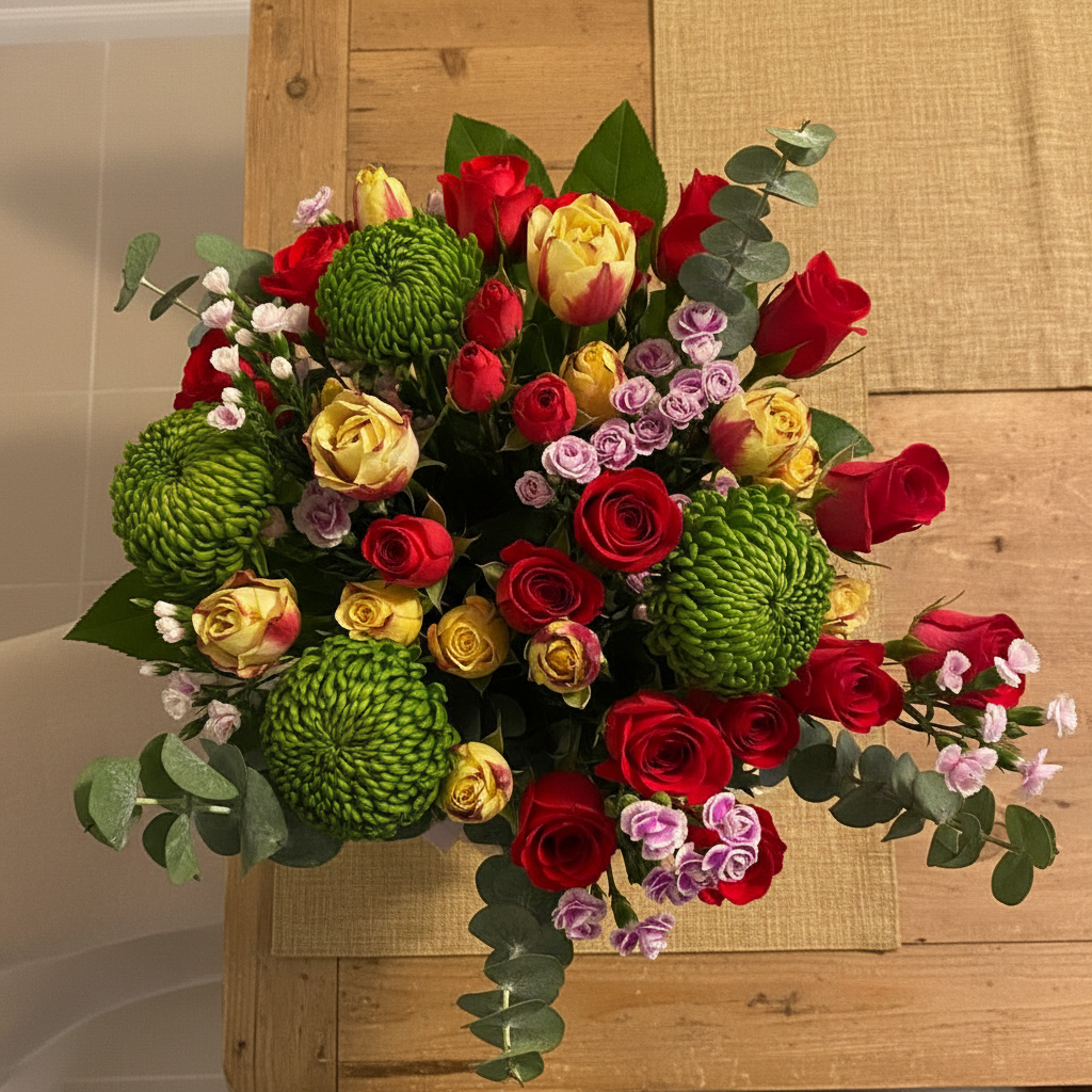 A delicate, elegant bouquet of premium roses and wildflowers, crafted to perfection with a blend of soft hues and natural beauty.