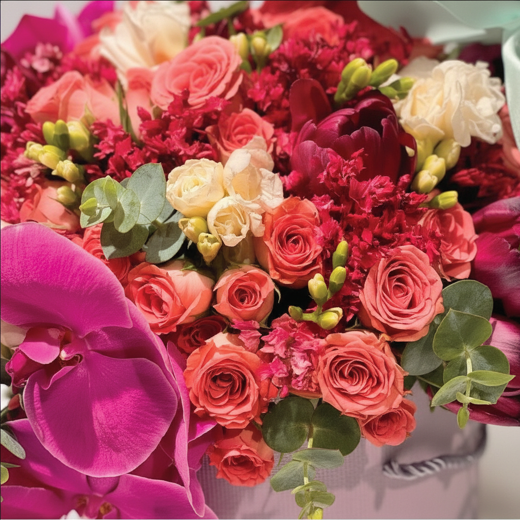 A round box arrangement featuring delicate orchids and mini roses in soft pastel tones, including shades of blush pink, lavender, and ivory. The flowers are artfully arranged to create a sophisticated, elegant look, with the orchids adding a touch of exotic beauty and the mini roses contributing a charming, romantic feel. This elegant floral display is perfect for any refined occasion.