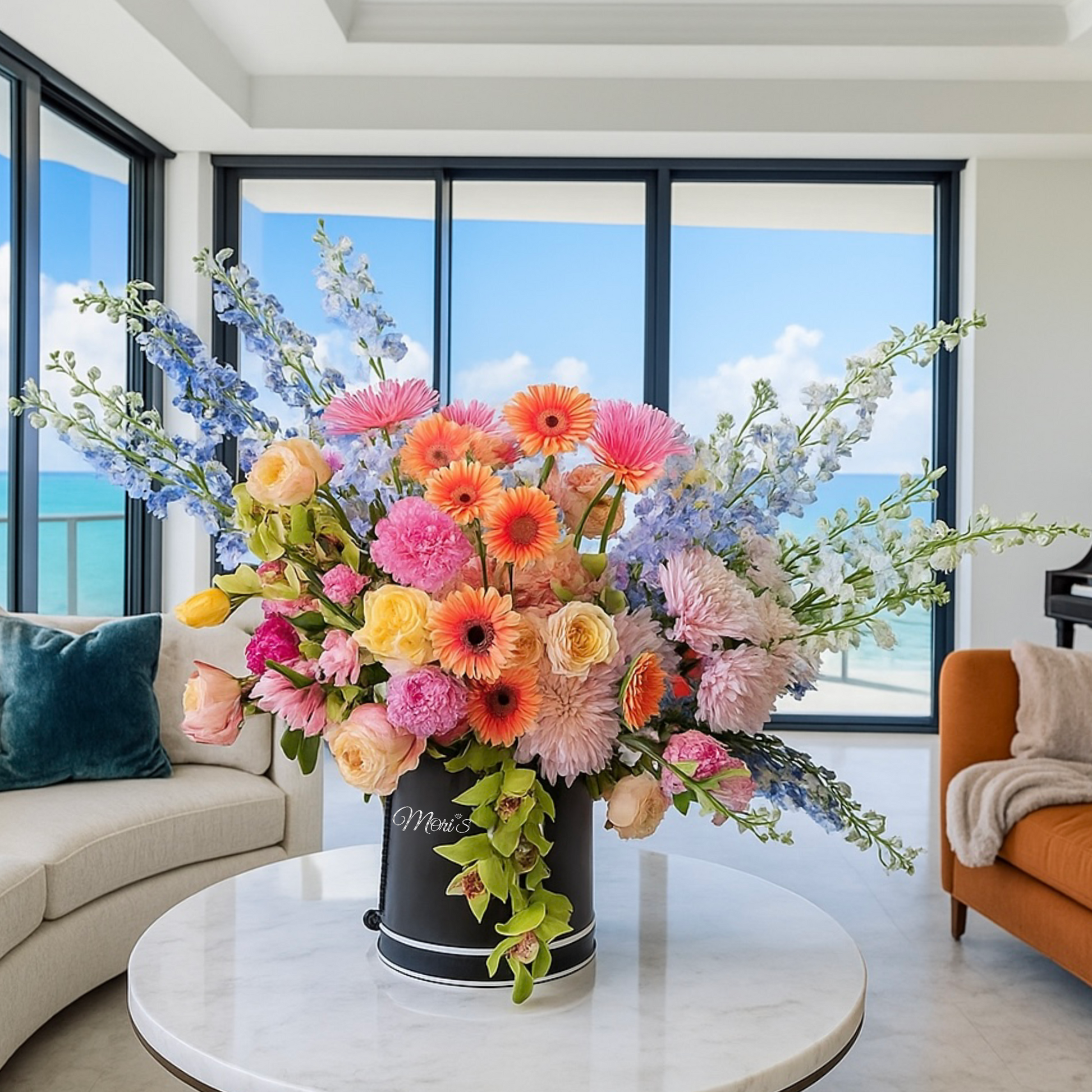 An elegant arrangement blending the passion of roses, the sophistication of orchids, and the cheerful vibrancy of gerberas. The mix of colors and textures creates a fresh, harmonious, and lively display.