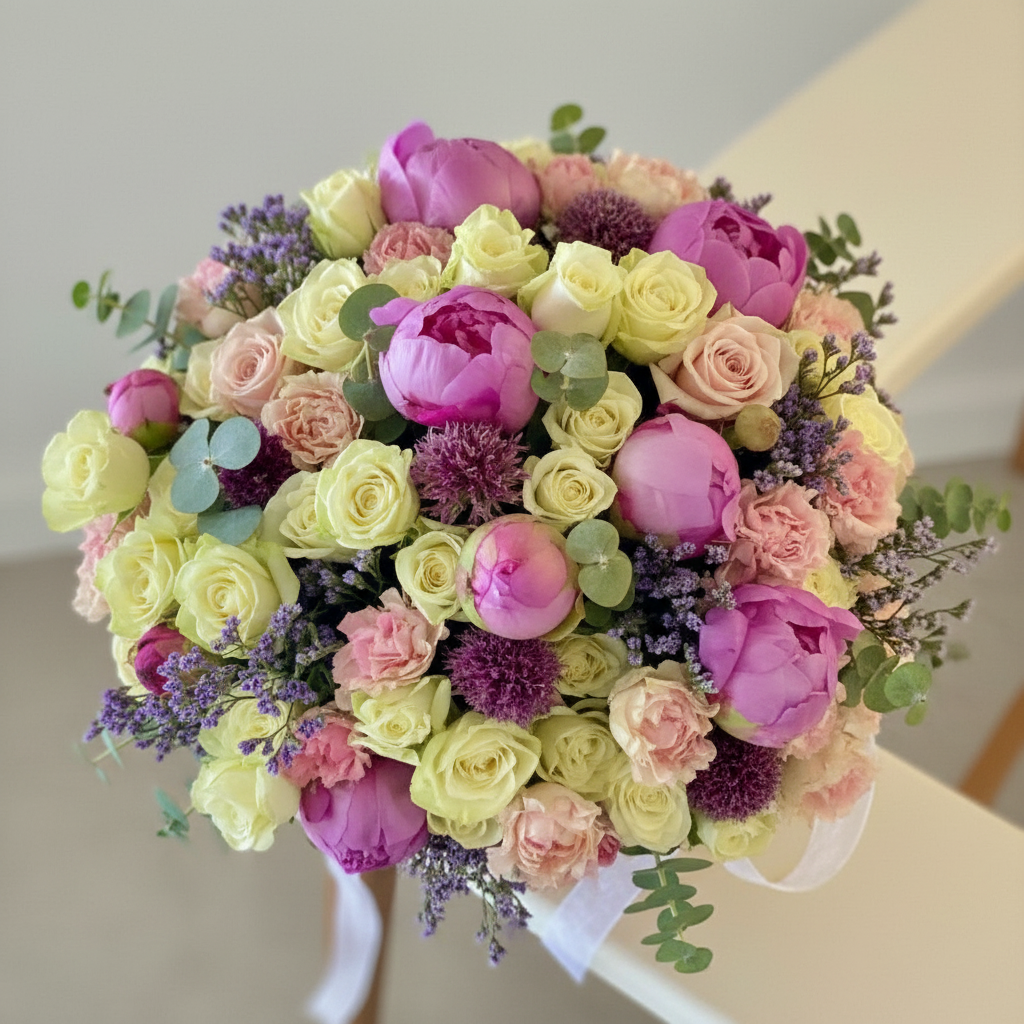 A beautiful arrangement in a basket featuring premium roses, peonies, tulips, and eucalyptus. The delicate flowers are complemented by the fresh greenery, creating an elegant and fragrant display
