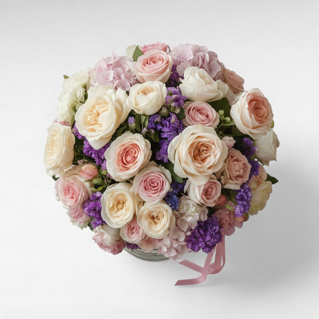A stunning arrangement of elegant David Austin roses among lush green foliage, beautifully presented in a sleek white box. The soft, romantic blooms contrast perfectly with the vibrant greenery, creating a modern and sophisticated floral display.