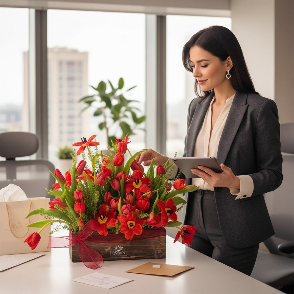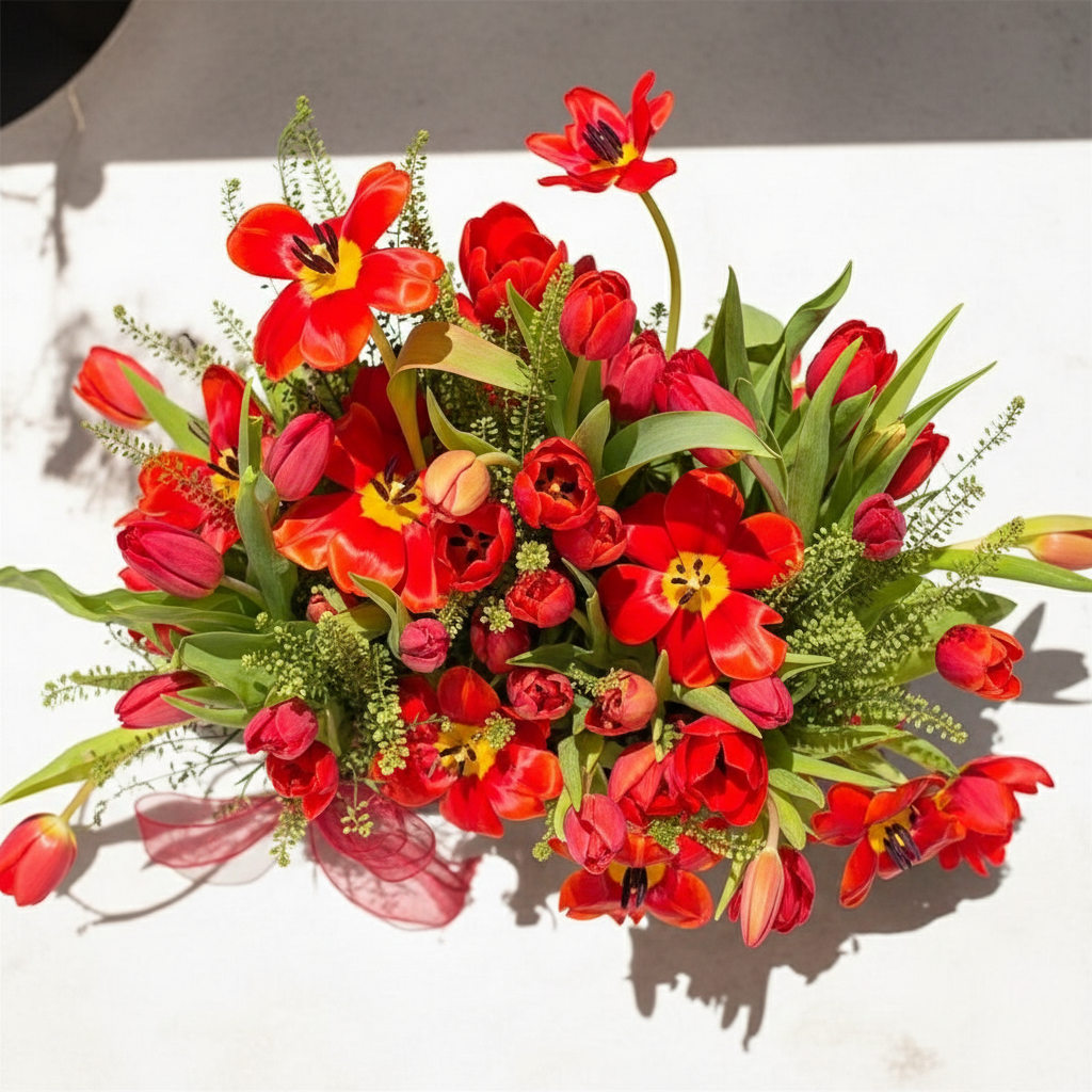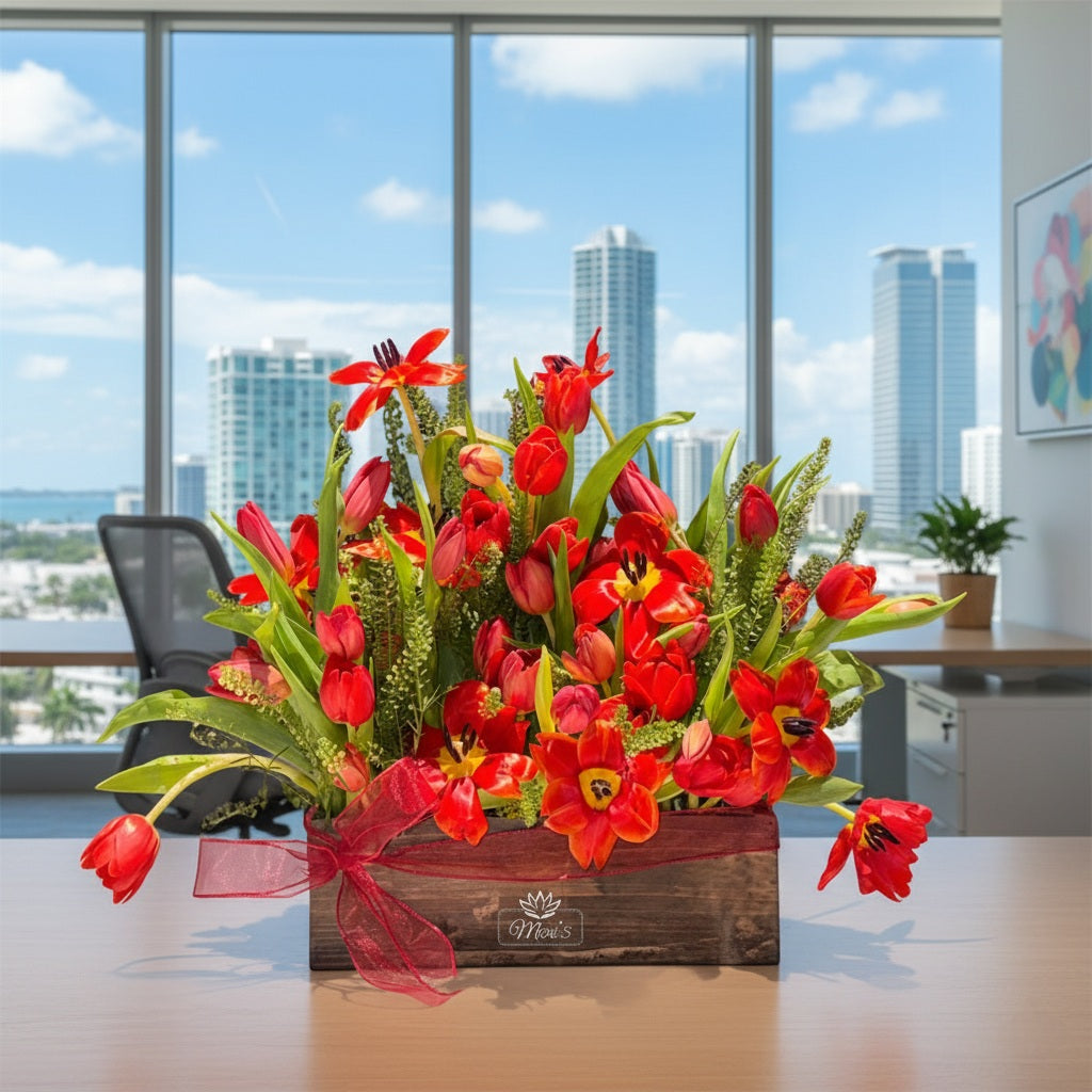"A charming arrangement of vibrant red tulips beautifully presented in a rustic wooden box. The tulips' graceful stems and delicate blooms exude elegance and passion, while the natural wood adds a touch of warmth and earthy charm. This combination creates a perfect balance of sophistication and simplicity, making it an ideal centerpiece or thoughtful gift for any occasion.