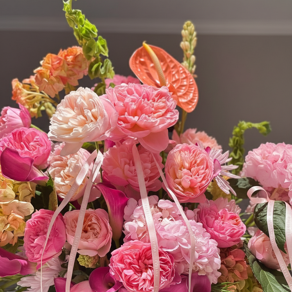 An elegant woven base filled with delicate hydrangeas, romantic David Austin roses, graceful calla, soft pink ribbons, and lush greenery, creating a charming and sophisticated floral display.